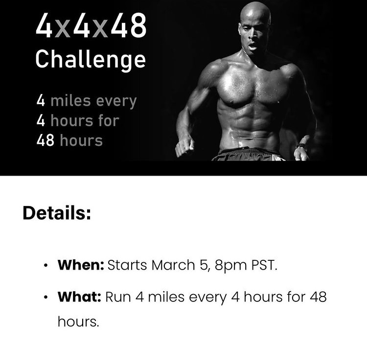 The challenge was the brainchild of the ex-navy SEAL and now “ultra-marathon runner, ultra-distance cyclist, triathlete, public speaker, and author” David Goggins. To put it another way, the man is a machine. The challenge he set was simple. Run 4 miles every 4 hours for 48 hours.